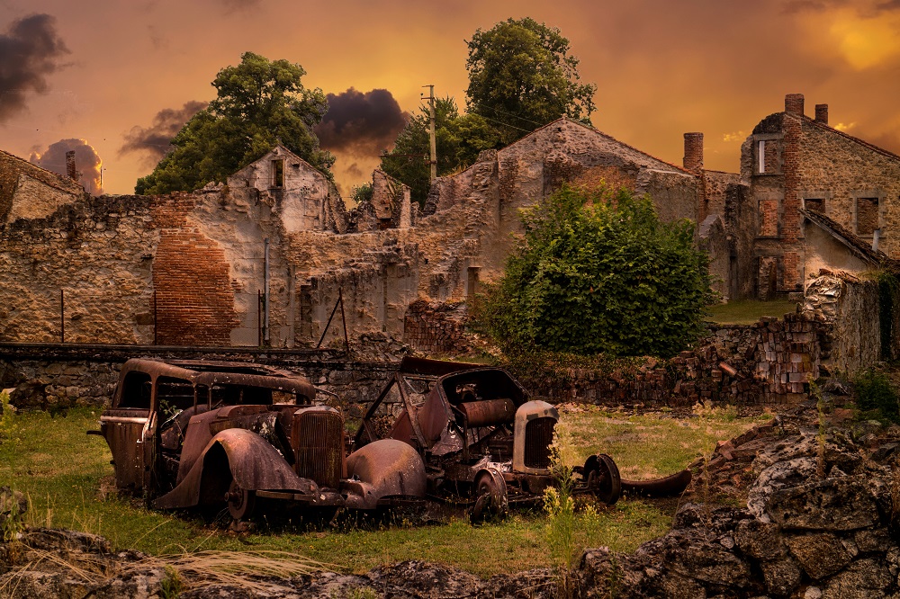 La commune martyre située à une vingtaine de kilomètres de Limoges abrite l’un des exemples les plus connus et les plus tragiques de l’histoire des villages français. En juin 1944, les nazis ont massacré 642 habitants de ce petit village, y compris des femmes et des enfants, en représailles à la résistance locale. Les bâtiments du village ont été laissés intacts depuis ce terrible événement, devenant ainsi un mémorial silencieux et poignant.